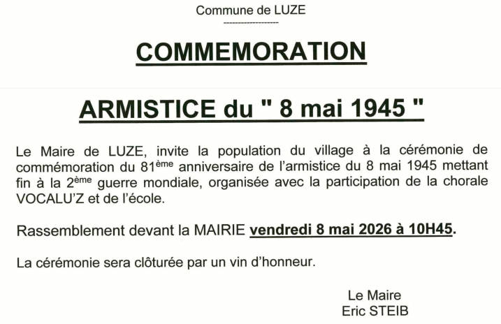 Commémoration du 81ème anniversaire de l’armistice du 8 mai 1945, vendredi 8 mai 2026 à 10h45 à la mairie.